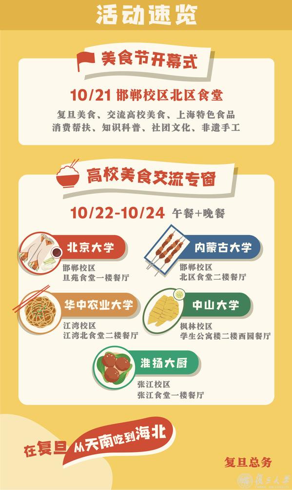 10月22日至24日,周三到周五狂欢继续。北大、中大、华农、内大+淮扬名厨,五路“厨神”集结复旦,带来地道烟火味!