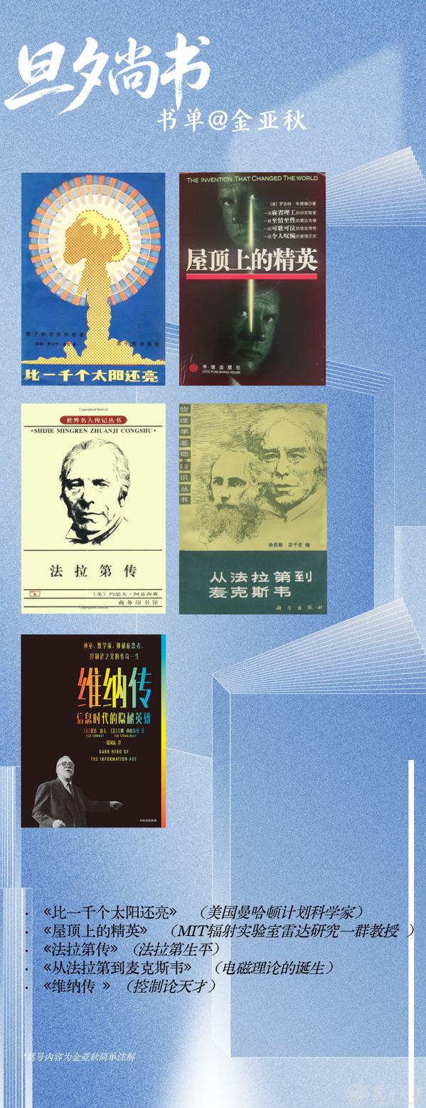 我一直爱看著名科学家的传记,这里面有科学、有历史、有哲学、有成功有失败。那时国内出了很多著名科学家写的小册子,比如华罗庚先生他们都写过一些,一毛几分钱可以买一本。每次周日我回学校(注:此指金亚秋的高中母校上海中学),都要到徐家汇的新华书店看看有没有新书,那儿的营业员都认识我。有时候出了好书,他们放在柜子里,等我过去再拿出来卖给我,这个事情是很感动我的。