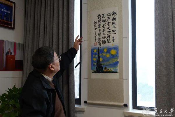进门后,最先步入中间的会客室。目之所及,一幅用中国画形式的“星辰夜空”诗画卷轴是他2024年的诗画新作,中西结合,形式创新。