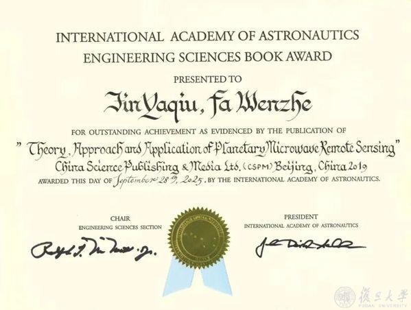 今年9月,中国科学院院士、未来信息创新学院教授金亚秋撰写的全球首部系统论述行星被动与主动微波遥感学术专著《行星微波遥感理论、方法与应用》获颁国际宇航科学院(IAA)图书奖。