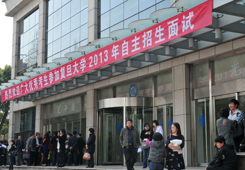 新闻中心讯 2013年3月8日,复旦大学2013年自主选拔录取改革试验面试正式开始。1000多名申请入学的上海考生和500多名苏浙考生将于3月8日至10日齐聚复旦大学分别接受专家面试。其中,上海考生将于8、9两日面试,江苏、浙江考生将主要集中于10日面试。