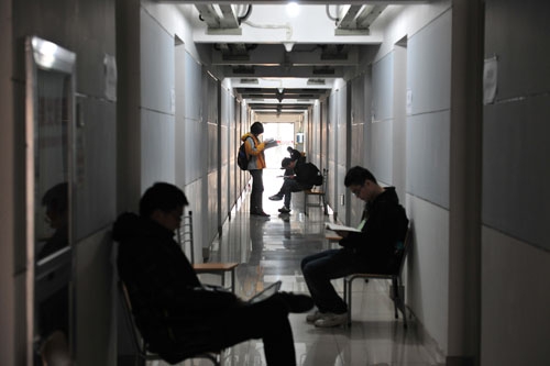 考场位于江湾校区生活园区,图为在考场外走廊上候考的同学。 摄影刘畅