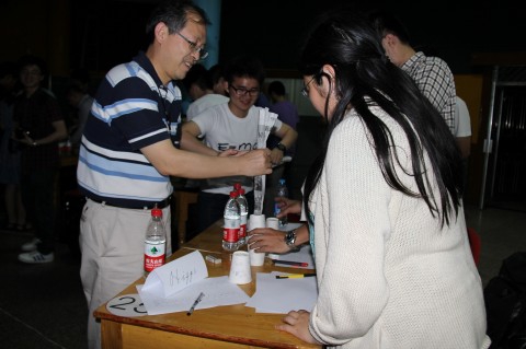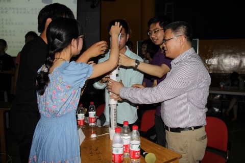 5月13日晚,叶耀珍楼多功能厅欢笑阵阵,“趣味物理知识竞赛”正在此激烈开赛。在本科生团学联副主席倪源蔚同学对本届“物理人节”进行简要回顾之后,比赛在轻松愉快的氛围中正式拉开帷幕。来自各个班级的6支参赛队在各自带队老师的带领下,为了集体的荣誉,展开激烈而又友好的对决。为了给同学们创造与老师亲密接触、与同学精诚合作的机会,并培养同学们的集体荣誉感,本次比赛在组织形式上作了非常精心的设置:各本科生和各研究生班级均需分别派出1支由3男1女4名学生组织的参赛队,且需邀请1位老师担任领队;每支队伍要取一个别出心裁的队名和口号,以便于开赛时的助威加油。在这一原则的激励下,为了集体的荣誉,各班级早早的行动起来,邀队员、请老师、想队名、定口号。正是之前的精心设置与充分准备,才有了比赛现场的精彩表现。