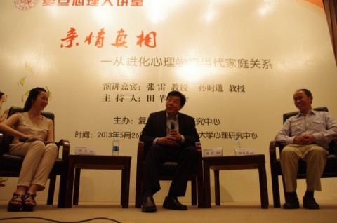2013年5月26日下午,由复旦心理研究中心主办的复旦心理大讲堂第4期“亲情真相——从进化心理学看当代家庭关系”在复旦大学逸夫科技楼顺利举行。现场座无虚席,来自于政府、企业、学术科研单位等各界人士,共计450多人出席了本次活动。本期大讲堂由香港中文大学教育心理学系主任张雷教授作主题演讲,复旦大学心理学系主任、复旦大学心理研究中心主任孙时进教授作主题回应,由复旦大学心理学系博士田芊主持。