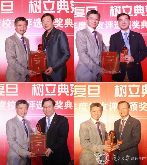 (左上至右下)陆雄文院长分别为岑钊雄、官远发、张维华、孙明波校友颁发“年度社会贡献奖”、“年度学院服务奖”、 “年度创新成就奖”、“年度卓越领袖奖”