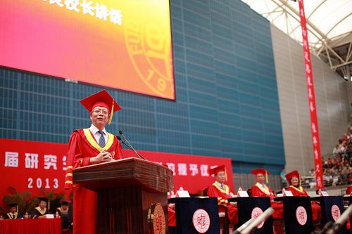 6月28日下午,复旦大学2013届研究生毕业典礼暨学位授予仪式在正大体育馆隆重举行。全校2013届博士、硕士毕业生和近千名家属齐聚一堂,共同见证了这一庄严神圣的时刻。全体在校的校领导,校学位委员会委员,各院系党政领导、导师代表出席典礼并为毕业生授予学位。杨玉良校长发表讲话,亲切寄语毕业生。