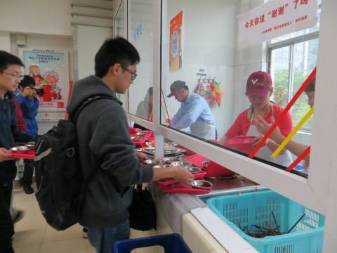 在餐饮服务体验中,我们跟随本食二楼西侧楼梯口两位阿姨,承担了高峰时段的碗筷归类分收工作。我们现场拜师,现学现卖,穿上工作服聚精会神地干了起来。短短十五分钟,我已经被纷至沓来的同学和渐渐累积不能及时消化的餐盘所困。多亏两位阿姨悉心指导,在旁协助,方才算顺利度过了当天的最高峰。之后我们略作休息,也在食堂二楼用餐,并与食堂负责老师和经理展开深入交谈。从学生们的吐槽集中点聊到食堂管理工作中校方的困难,从同学们的误解和困惑聊到全体食堂工作人员的辛勤劳动。那一餐我们吃了很久,我也从中了解到很多学校方面的工作细节和想法。