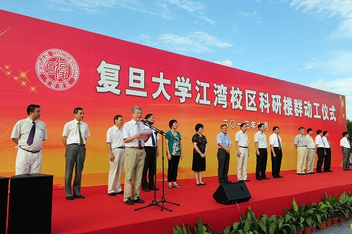 校长杨玉良在动工仪式上致辞。他讲到,江湾校区科研楼群的动工是复旦大学校园建设发展史上的一件大事,也是学校发展史上重要的里程碑,更是学校继往开来的新起点,她承载着复旦师生的期盼,吸引着社会各界的瞩目,也凝聚着全体复旦人的共同梦想。杨玉良指出,江湾校区本轮建设将从根本上缓解理工学科办学空间紧张、布局不合理的问题,是学校一项重大的系统工程,时间紧,任务重,压力大,要求全校上下振奋精神,团结一心,高起点,高标准,严要求,以高度的责任感和使命感,以只争朝夕的精神,加强工作协调,加快工程建设进度,确保工程建设质量,早日竣工,把已经绘就的蓝图变成现实,努力把新校区建设成为精品工程、亮点工程、廉政工程。