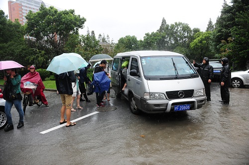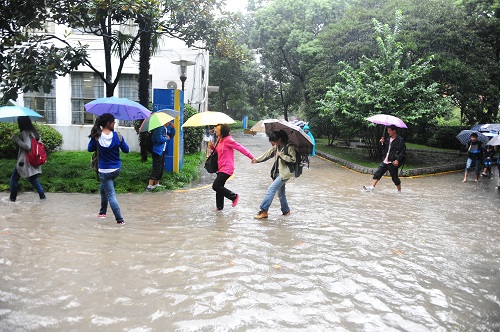 在雨势最猛烈之时,总务处处长周虎、副处长郭建忠、副处长王丽红亲临暴雨现场指挥工作。指挥中心不断收到北区配电房、幼托中心、400号楼、南区学生园区等各地的险情报告,而经过后勤员工的及时应急抢修,一一化险为夷。校园办增派工作人员在毛主席像以西、相辉堂、物理楼等多个积水严重地段打开窨井盖加速排水,现场派驻工作人员指挥交通,引导师生绕行,保证通行安全。
