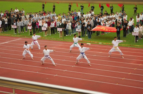 在运动会的入场式环节,学院各本科生班级、研究生班级以及教职工运动员方阵踏着整齐的步伐,喊着响亮的口号进入赛场,他们整齐划一、英姿飒爽的入场式拉开了本届运动会的帷幕。庄严肃穆的升国旗仪式后,张荣君老师宣布本届运动会正式开幕。学生运动员代表和裁判员代表进行了宣誓;王方椽老师展示了学院特地为本次运动会设计的奖杯和奖牌。随后,在本届运动会的文艺表演环节,热情洋溢的体育舞蹈、活力四射的啦啦操,以及空手道和中国武术表演赢得了全场热烈的掌声,把会场的气氛推向了高潮。