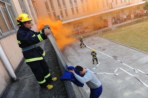 图书馆作为学校公用服务部门和消防安全重点单位,一直重视公共消防安全工作。每年11月图书馆消防安全周期间,各馆部除安排消防疏散演习外,消防器材使用培训、急救知识培训、安全设施检查等活动每年举行。为使本次的消防疏散演习达到更好的演习实战效果,在保卫处的大力支持下,还邀请杨浦区国定消防中队一起加入到演习中来,并增加了模拟喷淋救火、和云梯救援环节。当烟雾弥漫开来,读者看到弥漫的烟雾,闻到微呛的气味,听着不断鸣响的警报声,“实战”的感觉立即涌来,大家均服从值班馆员的指挥,迅速有序地从各个通道撤离到图书馆前后院内。国定消防中队接通消防喷淋水管,对模拟着火点进行喷淋灭火,并架起云梯,对二楼阅览室模拟被困人员进行了救援。