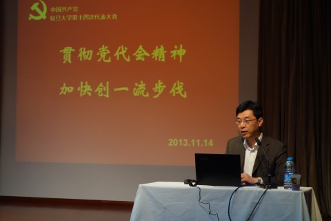 刘书记的报告内容详实、数据丰富,结合学习党的十八届三中全会精神,介绍了学校十四次党代会情况。他为我们回顾了2006年第十三次校党代会召开7年以来的历程,指出第十四次党代会明确的奋斗目标为初步建成具有中国特色的世界一流大学。围绕这一目标,要以服务国家为己任,以人才培养为根本,以改革开放为动力,深入推进内涵建设,全面提高教育质量,加快学校事业发展,为实现中华民族伟大复兴的中国梦而奋斗。为加快实现这一目标,要用服务国家战略、创新驱动战略、人才强校战略、学科提升战略、开放发展战略的战略思路,结合学科发展趋势和国家重大需求,加强对学科发展战略谋划;瞄准国家重大目标,转变科研组织方式;围绕国家战略,推进协同创新;完善本科培养体系,将通识教育理念贯穿本科教育全过程;坚持教书育人,增强师生互动;做好学生思想政治工作,促进学生全面发展;深化研究生教育改革,全面提高研究生培养质量;进一步完善学校内部治理结构,构建现代大学制度;推进校院两级管理体制改革,充分调动校院两级积极性;改进资源配置方式,不断提高办学效益;加快人事制度改革,激发人才队伍活力;明确以质量、创新、贡献为导向,进一步完善学术评价体系;主动拓展社会服务,扩大社会参与;紧密结合国家发展战略,全面提升办学国际化水平。同时,做好校区规划,以党的建设为引领,实现建设世界一流大学的“复旦梦”。