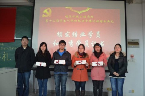 复旦大学信息科学与工程学院(以下简称信息学院)二级党校第十三期学生入党积极分子培训班结业典礼于2013年11月29日下午15:30在第四教学楼204教室举行,典礼由信息学院党建核心组指导老师蔡瑾主持。出席典礼的有信息学院党委书记周立志老师、校党委学生工作部副部长徐阳老师、信息学院党委副书记张荣君老师、信息学院学工组组长陈睿老师、信息学院研工组组长许妍老师,以及此次二级党校学生入党积极分子培训班的全体学员。