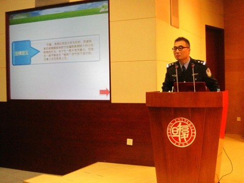 随后,市局城市轨道和公交总队刑侦支队反扒便衣行动队的高天春警官结合自身的反扒打击犯罪经历跟同学们讲述了在搭乘公共交通时常见的扒手的盗窃伎俩及如何防扒窃。高警官用一个个真实案例及现场模拟的方式引导同学们意识到在地铁及人流嘈杂的地方用手机戴耳机听音乐可能存在的被窃风险及背包拉链拉上后并不一定就很安全。他指出乘坐轨道交通时,地铁出入口、刷卡闸机口、上下车门口、电梯口都是失窃高发的场所,要把背包背在身前,提高防范意识。