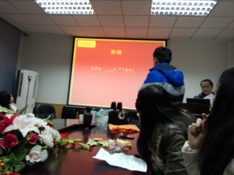 本次毛泽东知识竞赛的活动内容是精心筹备、丰富多彩的。活动第一板块进行了知识问答,通过必答、抢答等形式,考察了毛泽东生平、毛泽东诗词书法、毛泽东思想等方面的知识。活动第二板块为歌曲听唱,让答题的同学听红歌,答歌名并唱出,形式活泼,在动听的红歌猜答中回顾光辉岁月。活动第三板块为你画我猜,通过描述、动作、画图等形式竞猜一些关于党建的术语。同学们集思广益,气氛热烈。