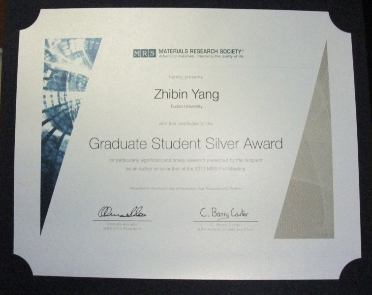 新闻中心讯 2013年12月5日,从正在美国波士顿举行的世界材料研究学会(Materials Research Society, MRS)年会上传来喜讯,我校高分子科学系和先进材料实验室彭慧胜课题组博士生仰志斌因为在新能源材料和器件方面的突出研究成果,荣获2013年度优秀博士生奖(Graduate Student Silver Award)。