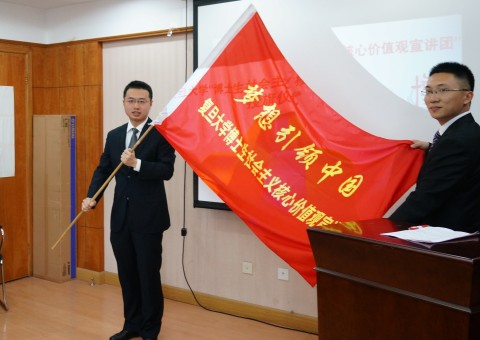研工部部长陈殷华在仪式上做了讲话。他高度肯定了讲师团长期以来的建设与成绩,认为社团真正履行了“学以致用双向增进,宣传理论服务社会”的成立宗旨。他向讲师们的辛勤付出和合作单位的大力支持表达了感谢。指出在讲师团12年来的发展历程时,有三条经验难能可贵并值得坚持:一是立足群众需要,无论讲座内容还是形式都始终紧密围绕群众需求;二是发挥复旦优势,利用复旦大学文、理、工、医的综合学科优势、人才优势来为社会提供多样化的宣讲服务;三是紧扣时代脉搏,不断根据社会发展形势任务、百姓新需求来推陈出新。对于社会主义核心价值观主题宣讲,他提出四点建议:要加强学习,增强理论涵养;要充分备课,提高宣传时效;要言行一致,发挥榜样作用;要坚持开放建团,不断丰富资源。陈殷华老师为社会主义核心价值观主题宣讲团授旗, 宣布“梦想引领中国”主题宣讲正式启动。