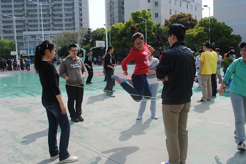 在步道启用仪式中,学工部部长徐瑾为健康步道铜牌揭幕,副部长艾竹为园区文化楼建基金优秀项目颁奖,体教部副主任孔斌介绍了“时光体育汇”比赛规则。最后,校党委副书记尹冬梅讲话,勉励复旦学子练就强健体魄,健康地为祖国建设贡献力量。随着尹书记的一声令下,到场师生从健身步道起点出发,开始了健身暴走活动。随后,在南区篮球场举办了“时光体育汇”活动,学生们体验了丢沙包、滚铁环、跳皮筋等传统健身项目,共同追忆儿时的美好时光。
