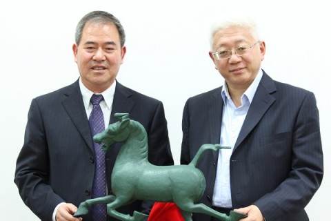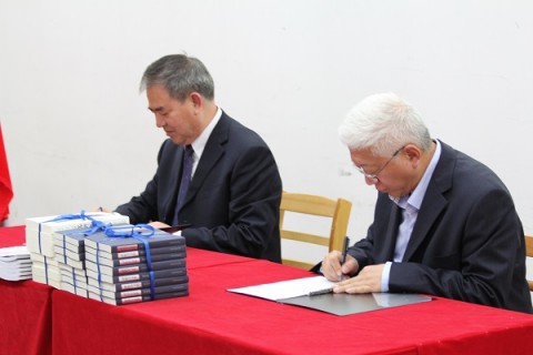 紧接着,捐赠签字仪式庄重举行。陈思和馆长、贾植芳先生侄女任桂芙女士,王德耀董事长以及刘仁义校长分别代表复旦大学图书馆、贾植芳先生、复旦大学出版社以及河西学院进行签字,象征着这批赠书真正开启了落户河西的旅程。为表感谢,河西学院分别向图书馆和出版社回赠了“马踏飞燕”铜像,并向任桂芙女士献上了捐赠证书。