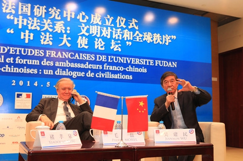 5月15日上午,纪念中法建交50周年官方系列活动之一——复旦大学法国研究中心成立仪式暨第一届复旦中法论坛在复旦大学隆重举行。法国原驻华大使毛磊,国家创新与发展战略研究会常务副会长、国务院参事室特约研究员、国际展览局名誉主席、中国原驻法大使吴建民,法国现任驻华大使白林,驻华文化参赞周子牧,法国驻沪总领事卢力捷,应邀出席了当天上午的活动。来自法兰西公学院、巴黎一大、巴黎政治学院、复旦大学、上海交通大学、同济大学、上海外国语大学、中国国际问题研究所、中国浦东干部学院等中法两国十余个学术机构的200余位学者、师生出席了活动开幕式,见证了复旦大学法国研究中心的成立。
