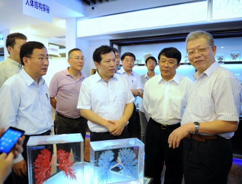 6月7日,复旦大学医学形态学平台“两馆一中心”,即人体科学馆、病理标本博物馆、临床解剖中心落成暨揭牌仪式在基础医学院举行。在揭牌仪式前,校党委书记朱之文、校长杨玉良、副校长、上海医学院院长桂永浩,在基础医学院党委书记袁继鼎、院长汤其群和其他部门领导的陪同下参观了复旦大学人体科学馆。