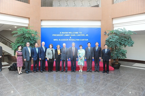 9月9日上午,美国前总统吉米•卡特阁下携其夫人罗斯琳•卡特女士和美国卡特中心人员一行访问复旦大学。中国人民对外友好协会会长李小林、副会长谢元陪同卡特总统到访。复旦大学校长杨玉良、副校长冯晓源在我校美国研究中心会见了卡特总统一行,对他们访问复旦表示热烈欢迎。卡特中心现任CEO梅•安•彼得斯,前任CEO约翰•哈德曼,卡特中心中国项目主任刘亚伟等人也参加了会见。