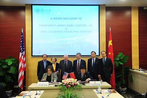 当天,在卡特总统夫妇的见证下,复旦大学美国研究中心与美国卡特中心正式签署合作备忘录。两大机构将在今后围绕“中美新型大国关系”开展合作研究、协同创新,并在共同主办学术会议、互派研究人员等方面开展深入合作。