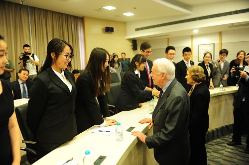 在离开会场前,卡特总统夫妇特地走到观众席前,与现场学生一一握手话别。