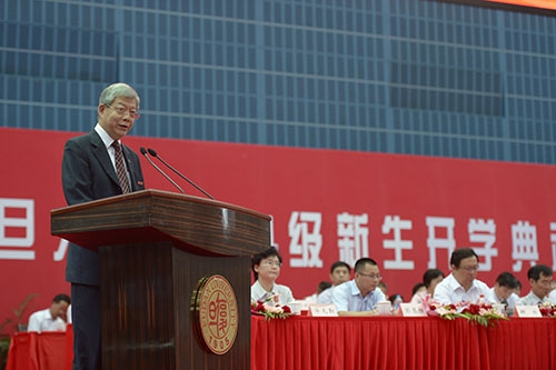 在全场师生的热烈掌声中,杨玉良校长发表了讲话。他勉励全体新生要“为学术研究而来复旦学习”,在研究生阶段从事一段扎实严谨的学术训练,为将来在各行各业的发展打下研究能力的基础。他指出,无论学生处于什么学科,学校的目的是为了培养有创新精神、有担当的人才,为研究生创造更多的自由空间,让研究生充分进行学术创新。他认为学术研究能够将自己所学的知识融会贯通,深入学习相关领域的知识,也能使人逐步走向成熟。他鼓励全体同学勇于和同学、导师进行学术探讨。最后,他期待所有师生共同努力,为促进国家和社会的发展做出自己的贡献。