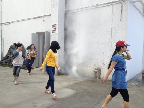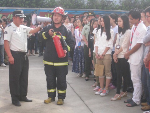在操场上,徐汇区公安消防支队的消防员针对这次演习活动做出了总结性的讲话。他指出,在这次演习中,大家撤离迅速,做到了临危不乱,表现值得肯定;但他接着指出,这次演习所用时间约为5分钟,在真正火灾时还是过长的。演习点评结束后,消防官兵向同学们发放了消防知识手册,并教授大家如何在火灾发生时进行正确的逃生及自救。之后消防官兵还为在场学生特别是14级新生讲解了消防安全知识及干粉灭火器的使用方法及注意事项,现场同学们在消防官兵和保卫处老师的指导下,陆续进行了灭火器的试用。整个过程持续约一个小时,于上午9点30分圆满结束。