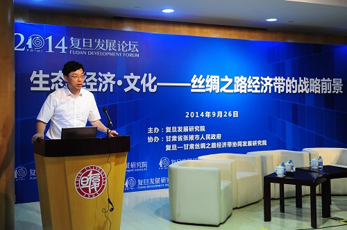 9月26日,由复旦发展研究院主办、中共张掖市委、复旦—甘肃丝绸之路经济带协同发展研究院协办的“2014复旦发展论坛”举行。本次论坛主题为“生态•经济•文化——丝绸之路经济带的战略前景”。甘肃省张掖市市委书记陈克恭、外交部亚洲司副司长杨健、复旦大学生物多样性研究所陈家宽、复旦大学历史地理研究所教授侯杨方等嘉宾受邀参会。复旦大学党委副书记、复旦发展研究院副院长刘承功在论坛上致辞。