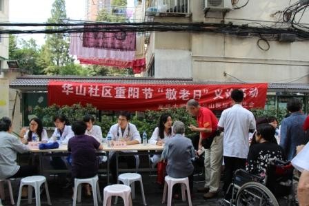 9月25日一早,由华山医院教育处研究生科朱春艳老师带队,博士生宣讲团联合研究生党支部来到华山社区老年人日间服务中心“阳光之家”,为社区居民开展重阳节“敬老日”义诊活动。来自血液科、消化科、神经内科、神经外科、胸心外科等学科的20余位优秀青年医师为100多位社区居民提供了义务健康咨询和诊疗服务。2个半小时的服务,现场气氛始终融洽热烈。在华山居民眼里,华山医院就是身边的医院,华山医院的博士医生尽管年轻,但有问必答,善解人意,细致贴心。能得到家门口的医疗服务,就是这些小医生带给他们的福分。