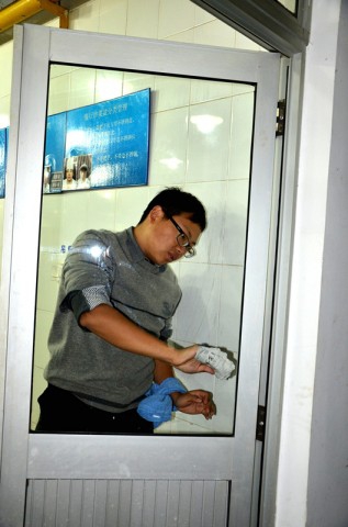 上午9点,正是同学们用完早餐的时间,也是江湾食堂的“大叔”和“阿姨”忙着清洁桌椅碟筷、准备午餐的时候,组员们的加入给了他们小小的惊喜。“看惯了饭点后的杯盘狼藉,学生们拿起抹布擦桌子、擦玻璃的情景倒是少见,擦得这么干净也真是难得”,正在拖地的一位“阿姨”如此表示。