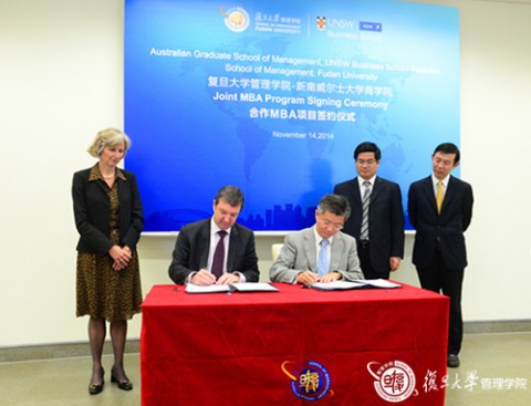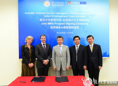 2014年11月14日,复旦大学管理学院-新南威尔士大学商学院合作MBA项目签约仪式在管理学院举行。新南威尔士大学商学院Chris Styles院长,复旦大学管理学院陆雄文院长、殷志文副院长和三十余位媒体记者共同出席了本次仪式。