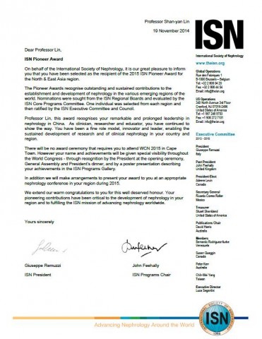 林教授自上世纪50年代建立华山医院肾脏科起,便投身中国肾脏病事业的早期开创发展进程。在林教授的引领下,华山医院肾脏科作为北上广3个中国肾脏病事业的重要发源地之一,始终走在学术前沿,并引领学界同行前行。文革结束后,林教授敏锐地觉察到中外肾脏病研究领域的差距,克服种种困难、不计个人得失,率先走出国门,到美国进修研习,并在80年代初放弃国外优厚待遇毅然回国。除了带回来国外先进的肾脏病诊疗技术理念和病人赖以生存的珍贵血透机器外,更重要的是他开启了国内一系列肾脏病生理学研究的先河,尤其是水盐代谢、高血压的肾脏发生机制及糖尿病肾病的研究。90年代中期林教授担任中国肾脏病学会主任委员后,带领并主导中国肾脏病学界同仁在国内推广现代肾脏病学的诊治方法,特别是慢性肾脏病的一体化治疗;重视边远地区的肾脏病分会的建设和发展、基层肾脏病专科医生的培养、以及全国的肾脏病透析移植登记工作,为全国慢性肾脏病人的规范化治疗、肾脏病基础研究的有效开展、肾脏病专科医生梯队的全面建设等起了不可磨灭的领导作用。在50多年的从医执教生涯中,林教授辛勤培养了90多名来自全国各地的研究生,绝大多数都已成为当地肾脏病学界的骨干,其中10多名学生已是各大学附属医院肾脏科的主任。虽然林教授近年来身体一直受疾病困扰,但他仍然抱病在研究生院学术周上微笑着给医院研究生们讲诉他50多年的从医感悟并鼓励他们在医学道路上继续前行;在肾脏科年中会议上仍然静静地聆听每一位医生的汇报并做出清晰中肯的点评;在全国的学术会议上仍然无私地讲授他整理积累的学术前沿知识并继续指引研究方向。林教授一贯欣喜学生成才,始终心系科室发展,长期致力于中国肾脏病事业建设,但他却素来淡泊名利、不求荣禄。此次国际肾脏病学会将2015年先锋奖授予林教授可谓是众望所归。