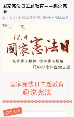 充分运用网络新媒体平台推送学习文章,解读重要理论问题,帮助广大学生深入了解宪法的重要意义。学工部党建微信订阅号“新闻新编”推出“今天,宪法如此亲近”、“读史•宪法的故事”、“问政•‘依法执政’为何不能简称‘宪政’”等系列文章;高分子系利用微信、易班等新媒体平台,开展“宪法光耀中国梦”主题活动,通过知识推送、在线竞赛和时政研讨等方式,面向班级全体同学宣传宪法知识,弘扬宪法精神,从民主法治的角度加深对于社会主义核心价值观的理解和认识。