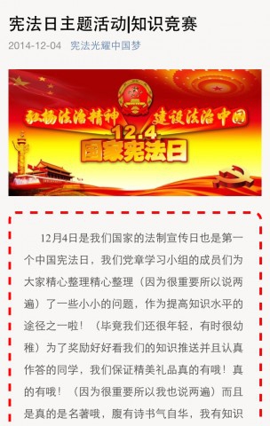 今年全国人大常委会以立法的形式确立12月4日为“国家宪法日”。在首个“宪法日”到来之际,我校学生通过召开专题报告会、座谈会、专题支部生活、新媒体专栏等形式,广泛开展宪法学习宣传教育,深入领会、贯彻十八届四中全会精神,进一步坚定依法治国理念。