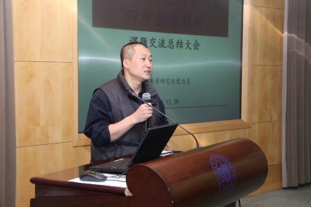 最后,储以微书记做总结发言。储书记指出此次总结大会在四中全会《决定》发布之后第一时间召开,正逢其时,为深入学习和贯彻党的四中全会精神开创了良好的风气和营造了健康的传播氛围。这次党员活动以课题申报的形式探索了创新组织生活方式,得到了各个支部、各位党员的积极响应。党总支日后将继续组织基层党建特色活动,丰富形式,增强实效。