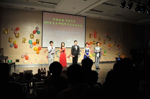 高歌颂友谊,热舞写青春。本次联欢会的序幕在热情奔放的双爵士舞中缓缓拉起,郑平主任的新年致辞,不仅分享了复旦神经科学2014年的收获与经验,也对我们寄予了2015年的期许。神经科学优秀研究生奖的颁发不仅是对获奖者科研工作的肯定,更是对每一位神经科学学子的激励。小品《neuronews》也正是以一个科研者的身份播报了科研中的大事小情,传递了科研的乐趣。该节目中“筷子姐妹”带来的“神舞”《小白鼠》更是精彩之极。