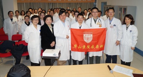 1月19日下班后,感染科为陈教授举行了欢送仪式,马昕副院长、耿道颖副书记以及党办、医务处领导出席并致辞,对陈教授以及感染科同仁的义举表示肯定,祝愿陈教授圆满完成使命,华山大后方将提供一切可能的帮助,解除陈教授的一切后顾之忧。陈教授说:“作为感染科医生,无论是SARS、禽流感还是埃博拉,疫情就是命令,我们责无旁贷。感谢领导和同仁的支持和帮助,一定不辱使命!”感染科同仁请陈教授把一面“感染科”的旗帜装进行囊,集体的温暖将伴随陈教授的西非征程。