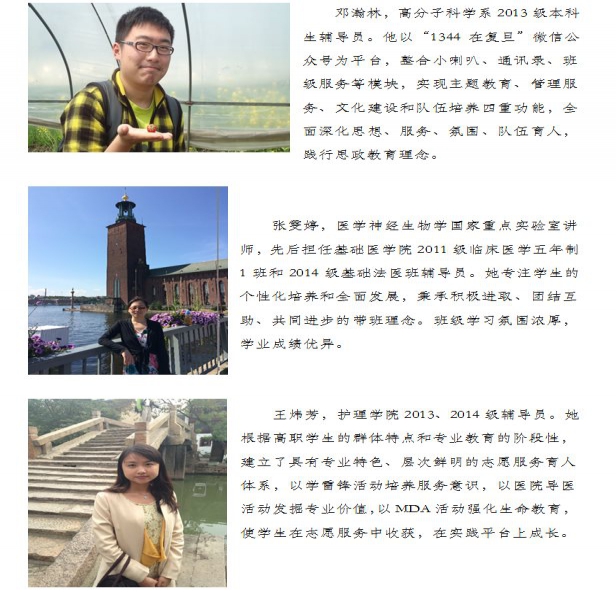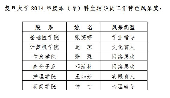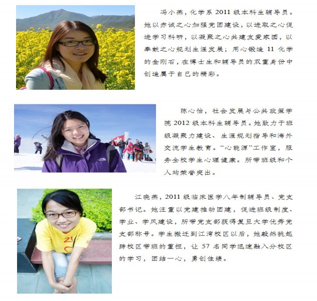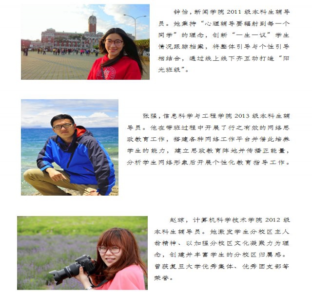 辅导员是帮助大学生健康成长的人生导师和知心朋友,也是学校宝贵的人才资源。复旦大学历来高度重视辅导员队伍建设,连续十一年举办“复旦大学本(专)科生十佳辅导员”评选活动,选树表彰了一批政治素质过硬、工作作风优良、深受学生爱戴的优秀辅导员,促进了队伍的交流和工作质量的提升,成为学校学生工作队伍建设的重要品牌。