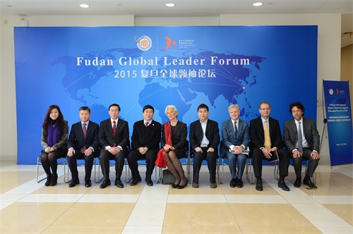 论坛开始前,复旦大学校长许宁生接见了拉加德女士一行,就共同关心的问题进行了亲切友好的交谈。随后,双方成员互赠了礼物并合影留念。