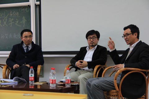 院长点评之后,三位老师一起上台进入讨论环节。班天可首先进行深入提问,探讨对于法教义学和社科法学的选择问题,孙笑侠用朴素生动的语言深入浅出地对此进行回应。接着涂云新提出“恶法是否应该被遵守”的问题与两位老师进行探讨,老师们侃侃而谈,场面十分热烈。