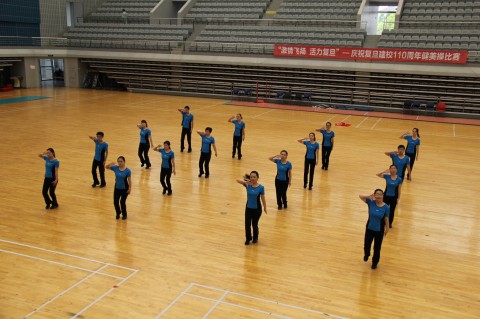 4月21日下午,动感的旋律时时飘荡于正大体育馆内,复旦大学第二届教职工健美操比赛正在此如火如荼地上演。此刻,正向主席台走来的是身着蓝色运动服装的物理系代表队。他们以一朵盛开的鲜花造型开场,又以同样的造型首尾呼应地收尾,一气呵成地完成了表演。整齐而有力的伸展、曼妙而灵巧的律动、流畅而自如的旋转、自信而灿烂的笑容,最终让他们赢得了B组第四名的好成绩。