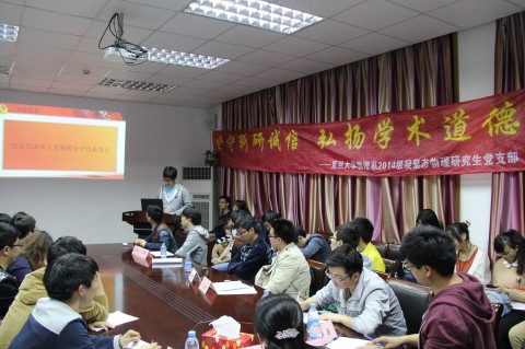 物理系的研究生作为基础学科科研的后备军,在源源不断地输出研究生成果的同时,也为保持复旦物理学术的纯净做着贡献,而研究生党员更应在其中发挥先锋模范作用。为始终坚守和弘扬这份纯净,督促每一位研究生在整个的科研生涯中始终坚守学术道德的红线,物理系2014级凝聚态物理研究生党支部于5月4日晚在物理楼216会议室专题策划开展了一场以“弘扬学术道德,争做正气物理人”为主题的组织生活会。本次活动作为复旦大学首届组织生活案例大赛的参赛案例,专门邀请了评委老师和多个兄弟支部的观摩团代表,请来指导和交流。