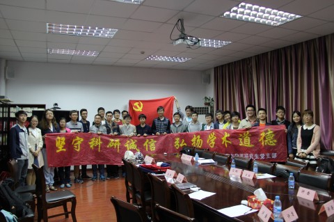 紧张的比赛结束后,进入代表发言和小组自由讨论环节。支部中已发表高质量论文的2位同学分别作为党员代表和入党积极分子代表首先发言,他们从社会现实出发,畅谈了自己对学术道德的认识和理解,并通过自己的科研经历和发表论文的过程,与同学们分享了相关注意事项和心得体会。他们的分享得到了在场同学的共鸣。4个小组在分别经过充分的讨论之后,委派小组代表将组员的意见进行了充分的表达,大家达成共识:科研上需要严谨的态度和诚信的精神,一旦有不端学术行为,对个人会殆害终生,对学术界会造成严重的不良后果。接着,大家满怀激情地在题有“坚守科研诚信 弘扬学术道德”的横幅上庄重地签上自己的名字,也将这一信念深深地烙印在心底。