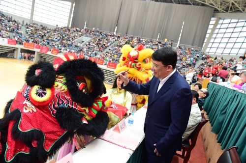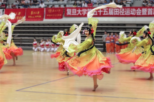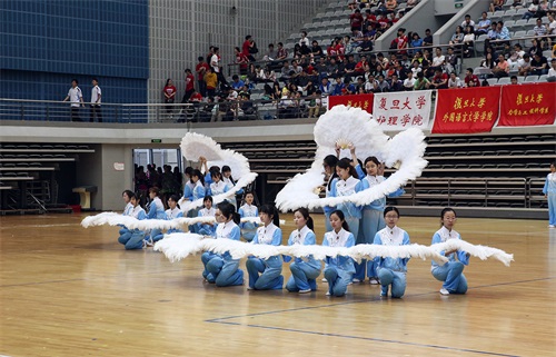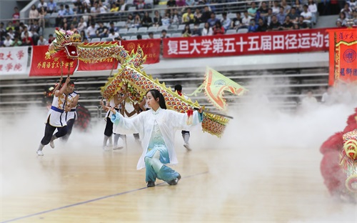 开幕式第二环节是教学展示。健美操与体育舞蹈的联合演出让人眼前一亮、印象深刻,同学们用飞舞的白扇摆出数字“110”的队形,献礼建校110周年。校舞蹈团带来群舞“百花争艳”,教工健美操比赛一等奖队伍进行汇报表演。最后,舞龙舞狮体育专项班表演“龙腾狮跃”,节目表演之前,朱之文书记为狮子“点睛”,将整场表演推向高潮。