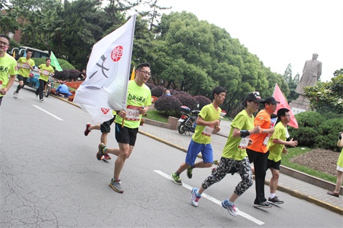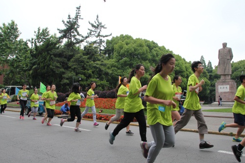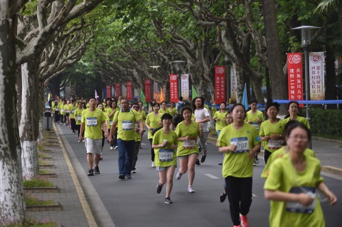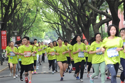 上午8:30,复旦大学极限运动协会、舞龙舞狮队和啦啦操队相继登场,精彩而又不失新意的表演活跃了现场气氛。同时,参赛选手到指定地点检录入场。8点55分,健美操队员带领现场选手进行热身。9点10分,发令枪响,选手有序出发。很多参赛选手面带笑容悠闲慢跑,向现场媒体做出各种开心的手势,出发区一片欢乐场面。比赛线路将相辉堂、校史馆、子彬院、望道园、曦园、光华大道等复旦标志性建筑串连起来,不仅可以让选手在比赛过程中欣赏复旦夏景,run for fun,更可以让校友们在跑步中回忆在母校点点滴滴,增添复旦情怀。