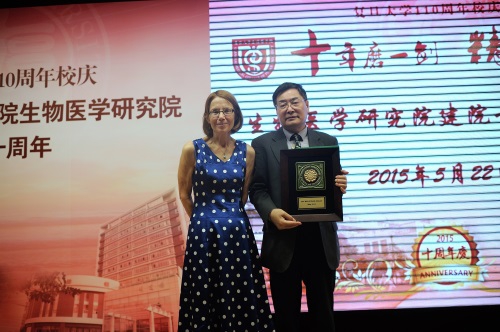 中国科学院院士魏于全、陈洪渊,中国工程院院士陈灏珠,以及来自学校有关职能部处、院系、附属医院、IBS和美国韦恩大学的400余名与会者欢聚一堂,共庆建校110周年暨IBS建院10周年。庆典大会在现场播放《生物医学研究院十周年庆专题片》中拉开序幕。韦恩大学医学院副院长Bonita博士宣读了韦恩大学的贺信,并向IBS常务副院长杨芃原赠送纪念品。贺福初院士以“人类蛋白质组计划及中国的贡献”为题发表讲演,回顾了世界蛋白质研究计划的起源和历程以及IBS的筹建历程,并强调了我国在蛋白质研究计划中所处的重要地位。贺林院士以“回家”的心情,在致辞时回顾了在IBS的难忘时光。