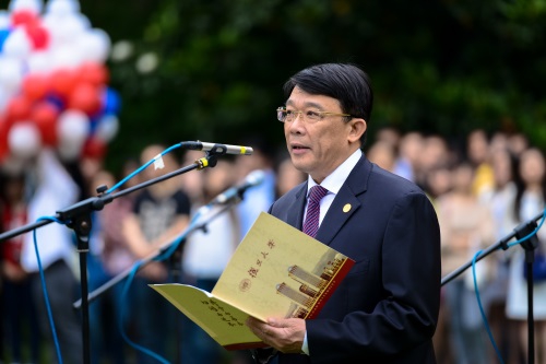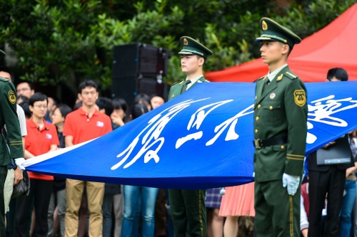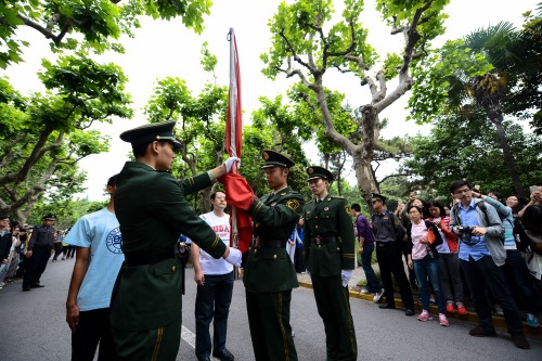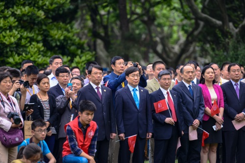 新闻中心讯 2015年5月27日清晨,“日月光华,春秋无止”复旦大学110周年校庆升旗仪式在我校恒隆物理楼前国旗坪举行。全体校领导、部处领导嘉宾、来自世界各地的校友代表和自发而来的师生1000多人齐聚国旗坪前,共同庆祝母校110周岁生日。